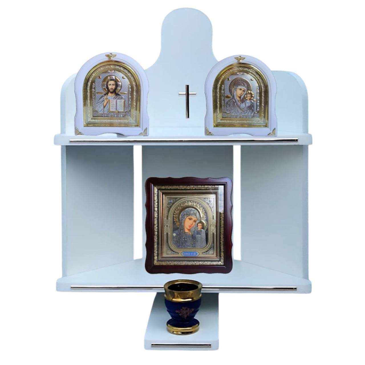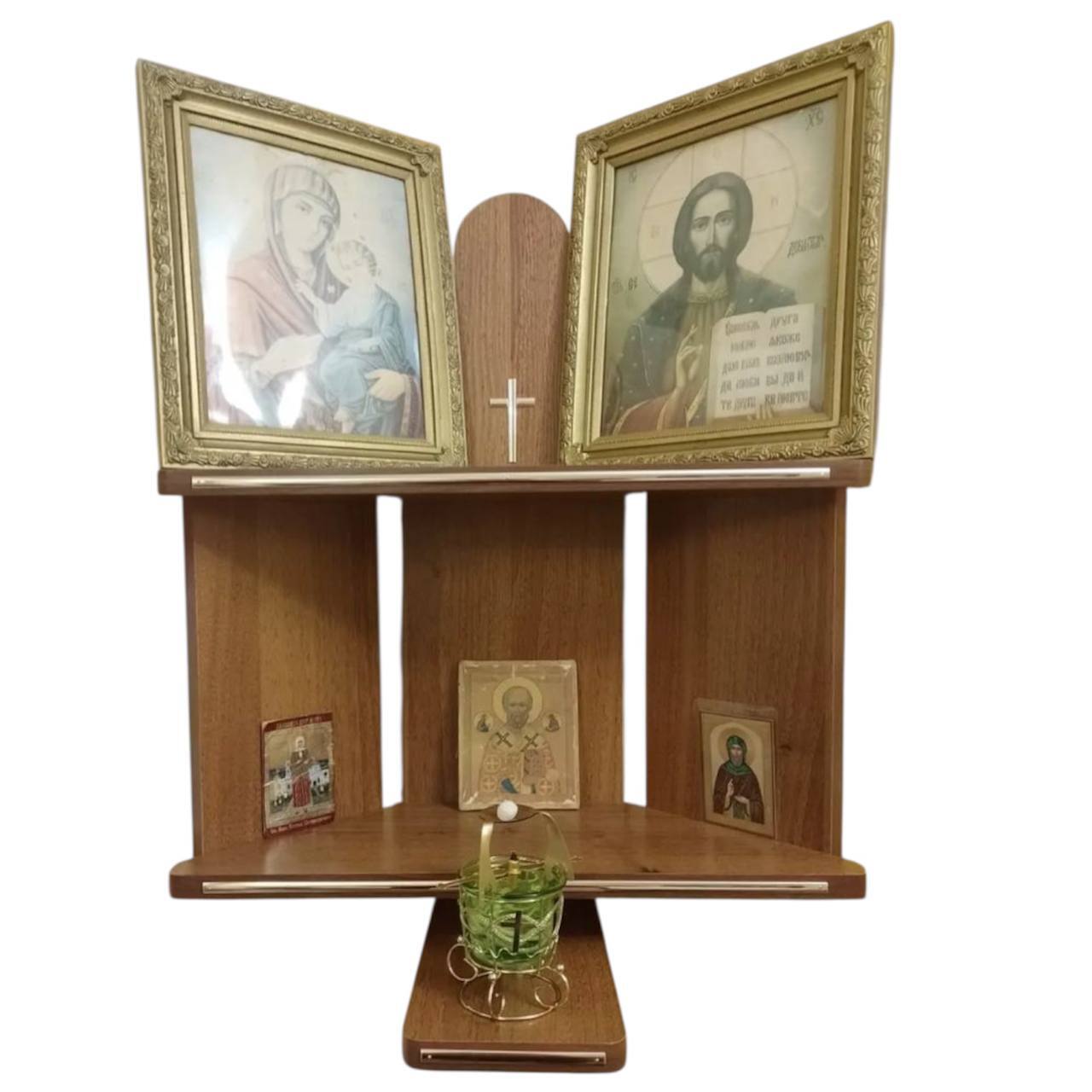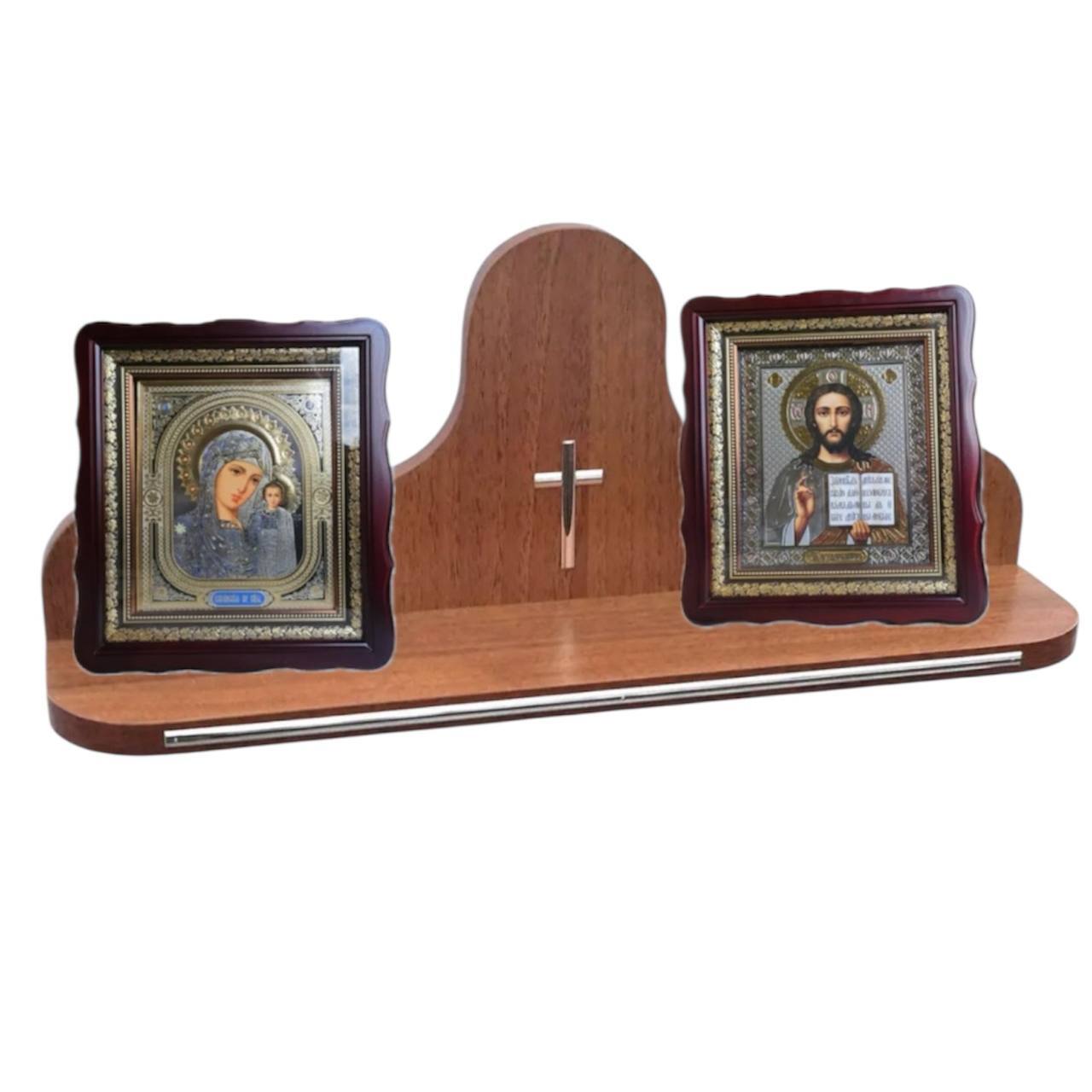 ✔️Двоярусна зручність: Наявність двох ярусів дозволяє зручно розмістити кілька ікон різних розмірів, лампадок, свічок або інших релігійних атрибутів. Ви можете створити красиву композицію, розташувавши головні ікони на верхньому ярусі, а додаткові – на нижньому