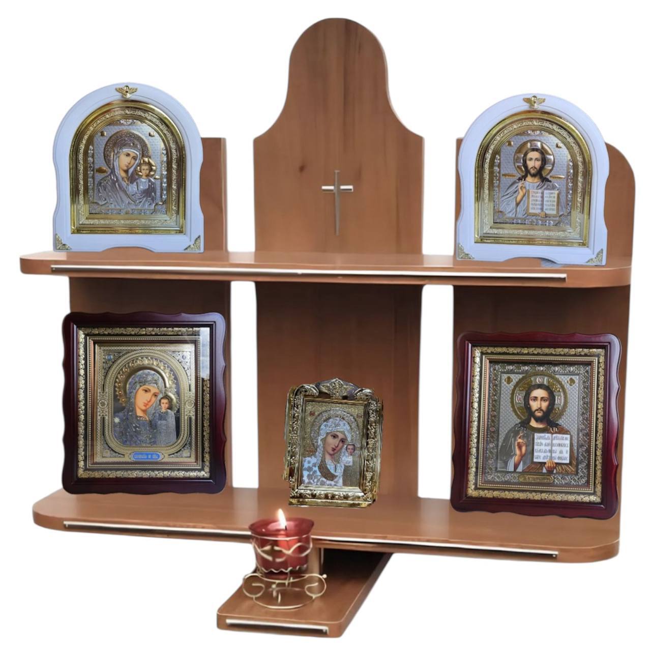 Наявність трьох ярусів дозволяє зручно розмістити кілька ікон різних розмірів, лампадок, свічок або інших релігійних атрибутів. Ви можете створити красиву композицію, розташувавши головні ікони на верхньому ярусі, а додаткові – на нижньому.