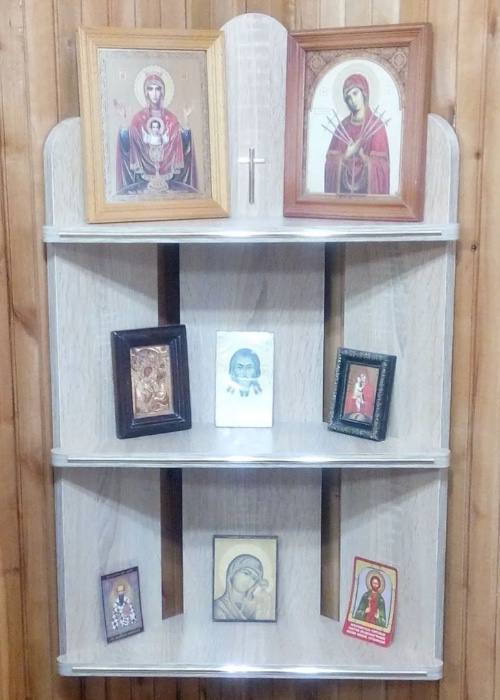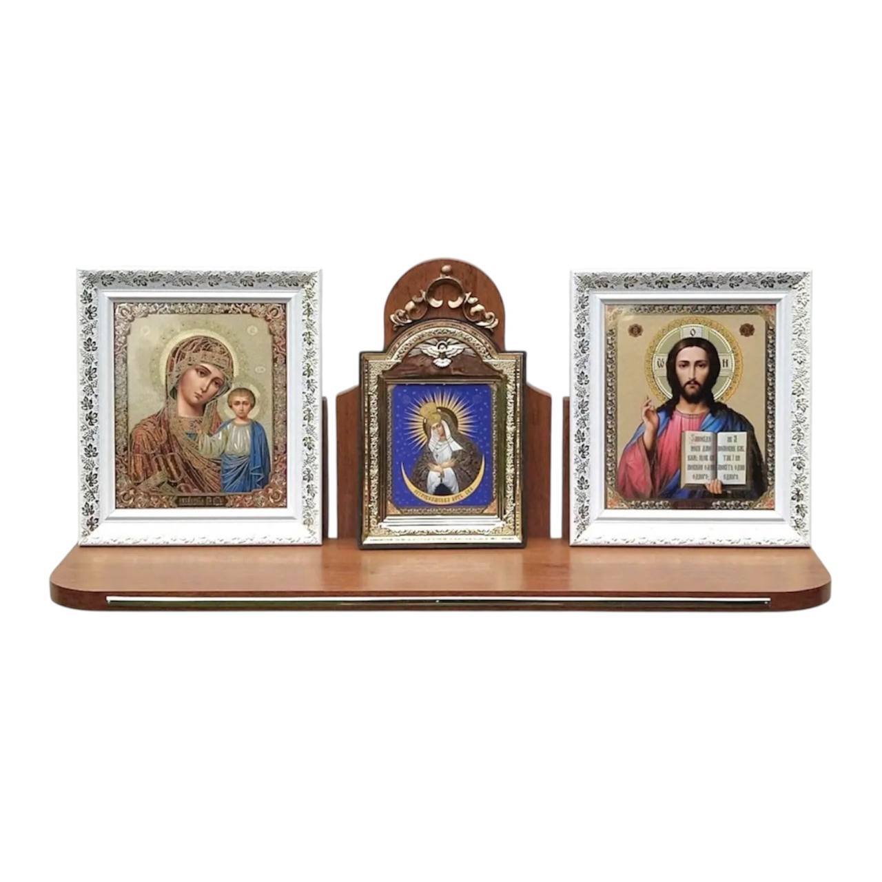 Наявність трьох ярусів дозволяє зручно розмістити кілька ікон різних розмірів, лампадок, свічок або інших релігійних атрибутів. Ви можете створити красиву композицію, розташувавши головні ікони на верхньому ярусі, а додаткові – на нижньому.