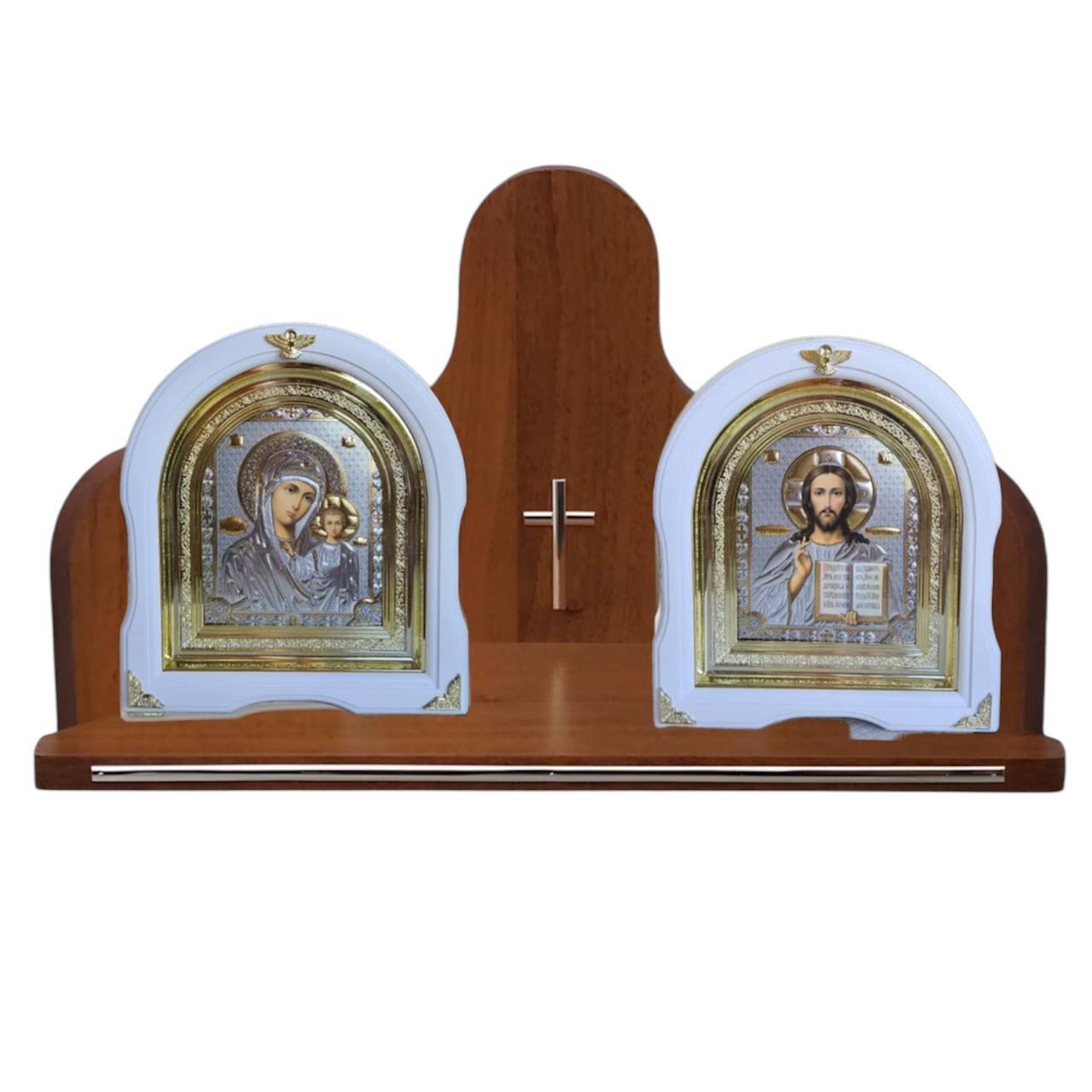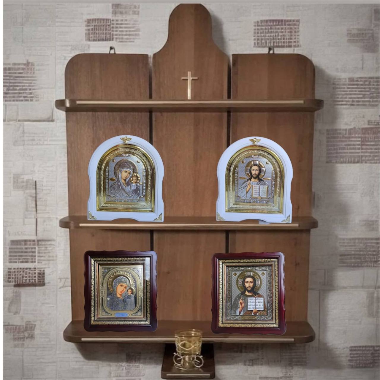 ✔️Двоярусна зручність: Наявність двох ярусів дозволяє зручно розмістити кілька ікон різних розмірів, лампадок, свічок або інших релігійних атрибутів. Ви можете створити красиву композицію, розташувавши головні ікони на верхньому ярусі, а додаткові – на нижньому